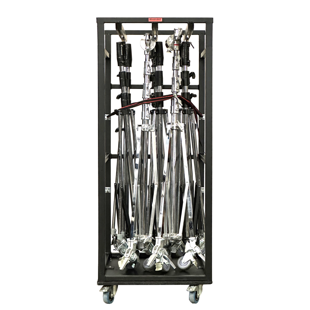 A large utility cart for transporting mediuim size stands like 126-CSU, Kupo heavy-duty baby stands, A1020 low-boys and son on. Fits around 15 stands on the rails. Recommended for the studio and for the car that has a lift.