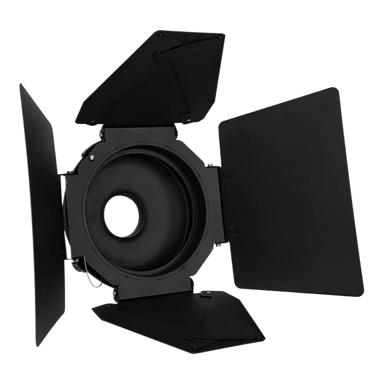 Professional 8-leaf barn door system designed for the F10 Fresnel, enabling precise shaping and cutting of high-output beams. Ideal for controlled, cinematic lighting setups.