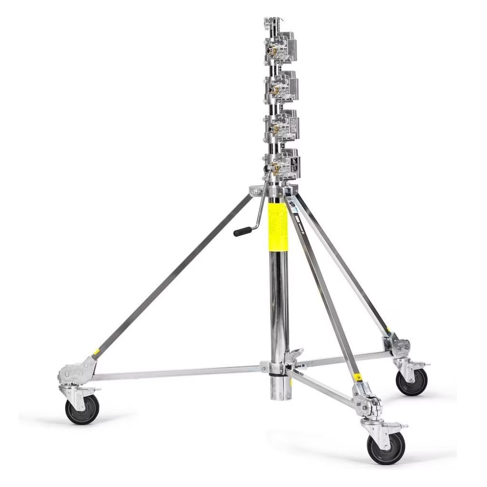 Avenger 4R Strato Super Crank Stand – A professional heavy-duty crank stand with 4 risers, designed for safely lifting large film lights, rigs, and overhead setups. The geared crank system allows smooth raising and lowering of heavy loads, while the solid steel construction ensures maximum stability and reliability on set. Perfect for demanding film and photo productions where secure, high-reaching support is essential. The stand comes with the standard studio casters, not the big foam wheels for outdoors.