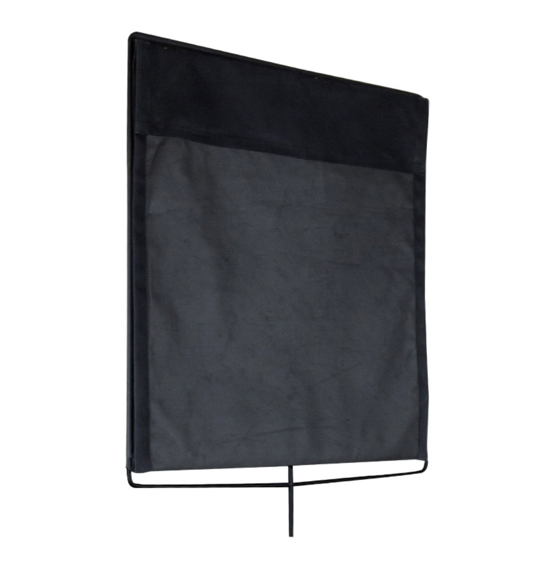 Floppy flag 90 x 90 cm with top hinge is made of opaque fabric with a rigid frame. It measures 90 x 90 cm. and can be opened to a size of 90 x 180 cm by detaching the velcro. Features a Velcro sewn on the back of flag that makes it firmly stick on the stand. A rolled-up edge in one end of flag allows you to put rod or tube as weight to keep the flag straight.